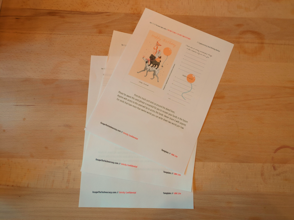 The Underground Backup Kit includes multiple printable PDFs allowing you to create easy backups for your seed phrases, your main passwords, and other choice information. Print it, fill it out, laminate it, and hide it wherever you think is best. No single-use overpriced steel, no shipping to your home address, no exposure of your name tied to crypto: finally a tester-friendly and true privacy option for backing up the crucial bits of data in your life: whether seed phrases or passwords.